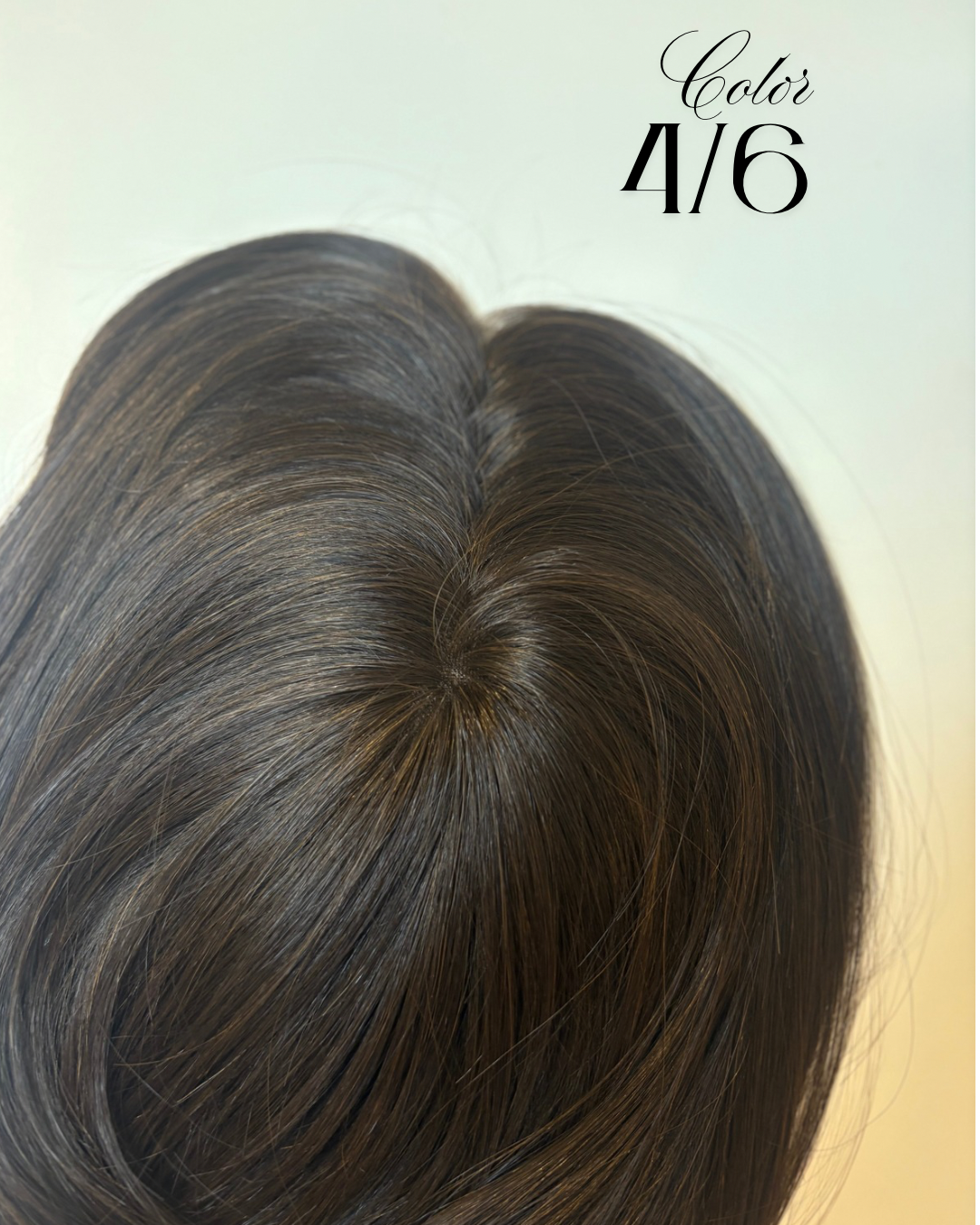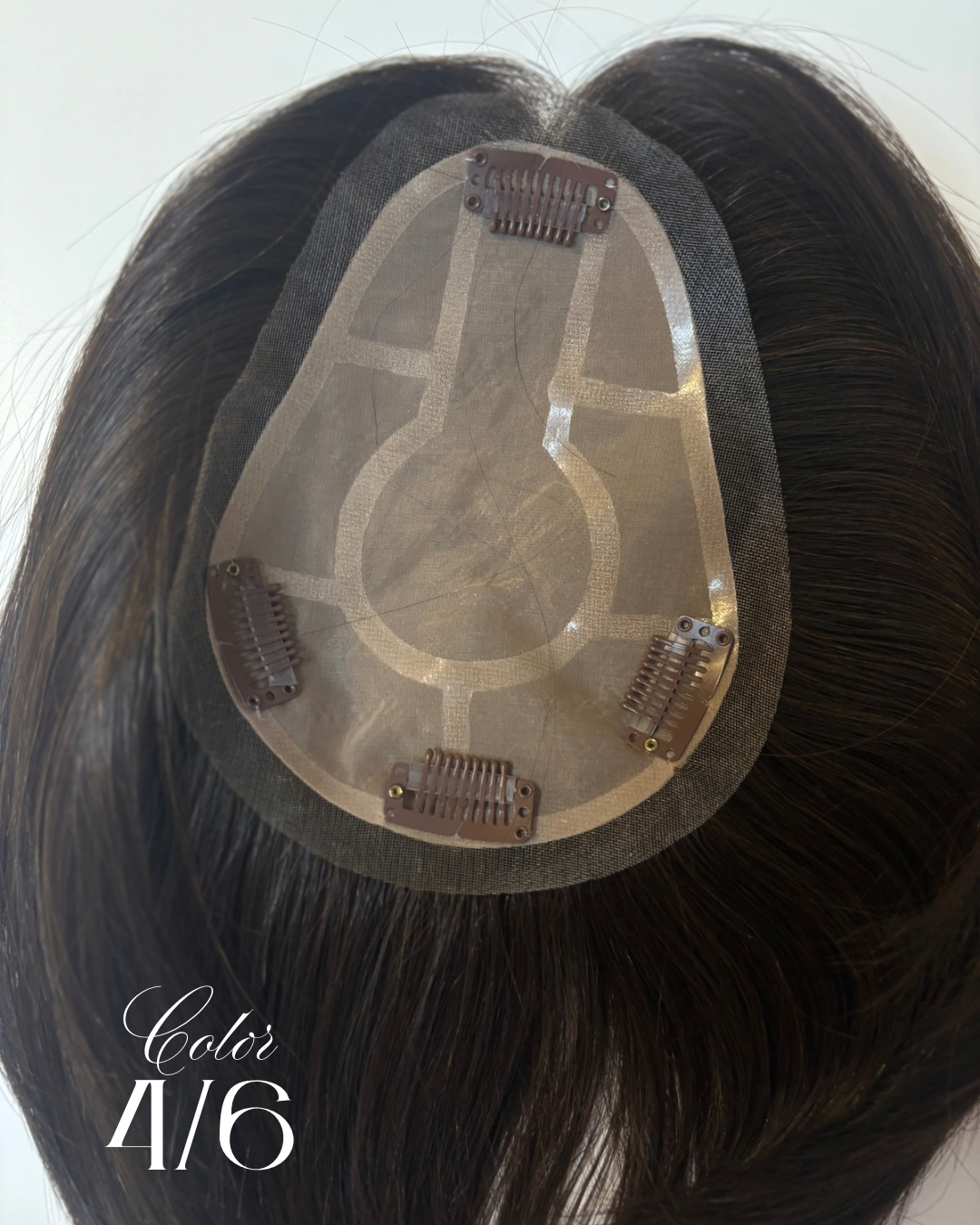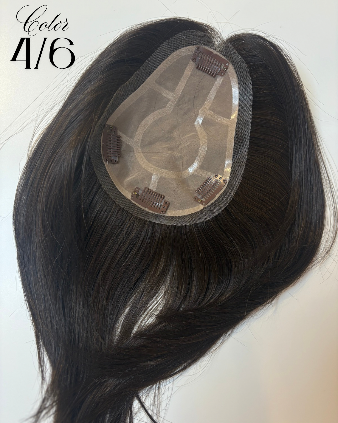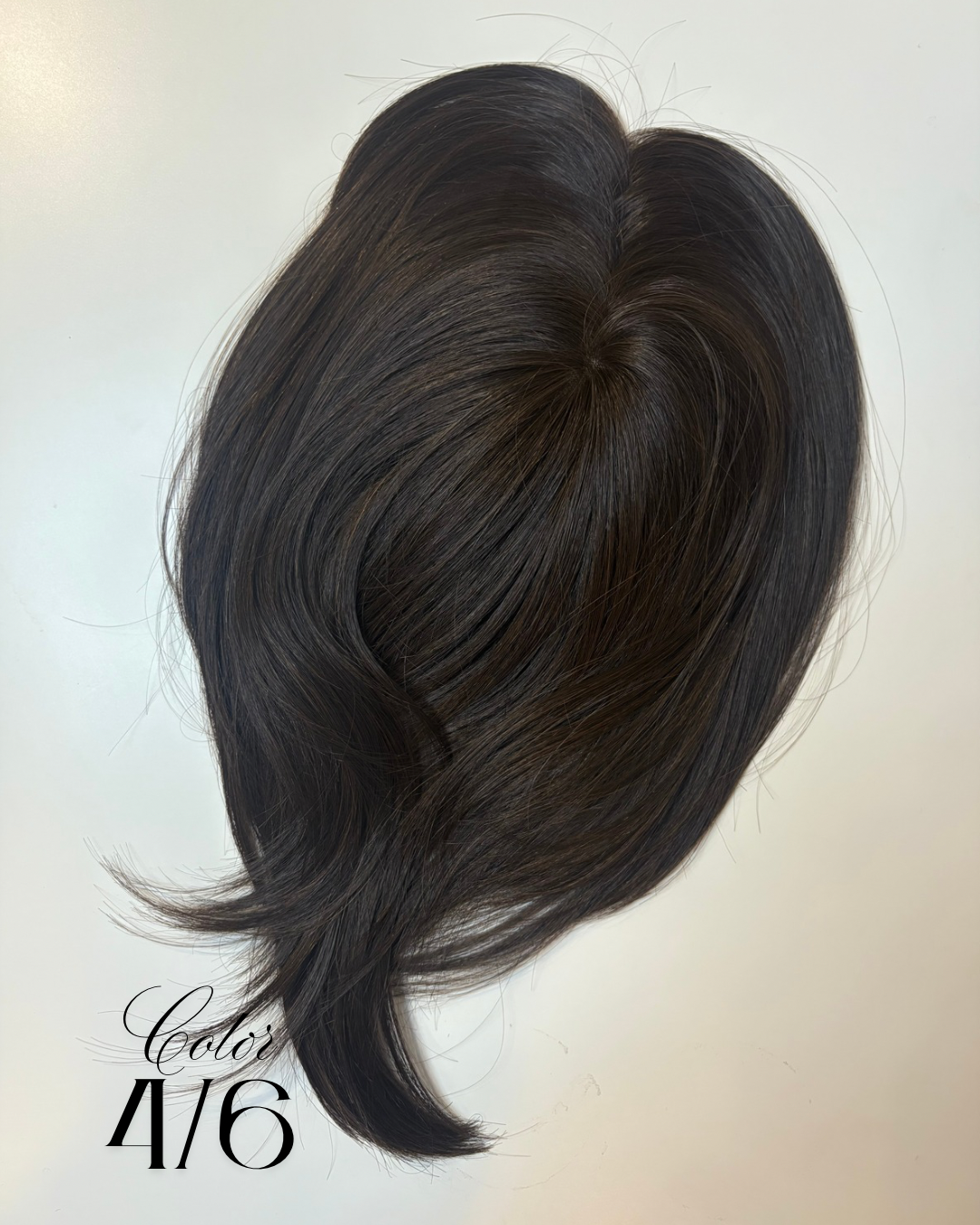 The pear-shaped base of this elegant topper lets you position the smaller or wider end as needed to appropriately conceal the area of hair loss. A sheer lace border lies flush to the head with no tell-tale edge. Our favorite feature? The soft, silky smooth extra layer that protects and comforts a sensitive scalp. Choose the 10” option to blend with chin to shoulder length hair.