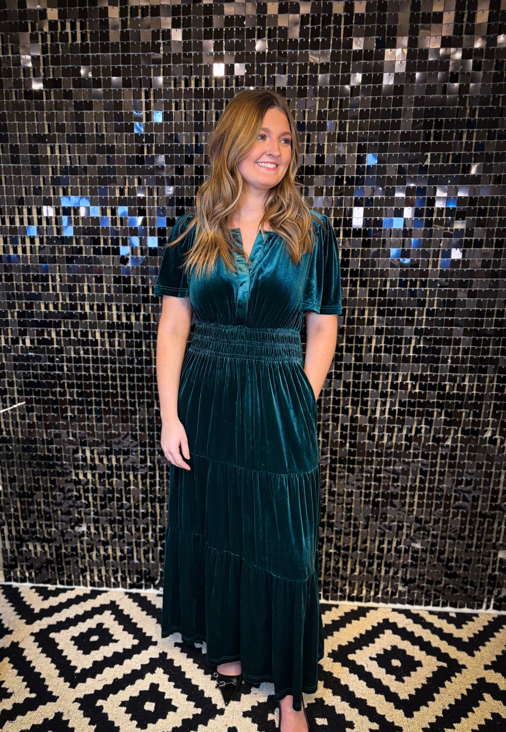 Make an entrance in this stunning emerald green velvet maxi dress. Luxuriously soft with a rich, luminous sheen, it features a classy V-neckline that flatters effortlessly. The flowy maxi length adds grace to every step, while hidden pockets bring a touch of everyday practicality to this timeless, elevated look!