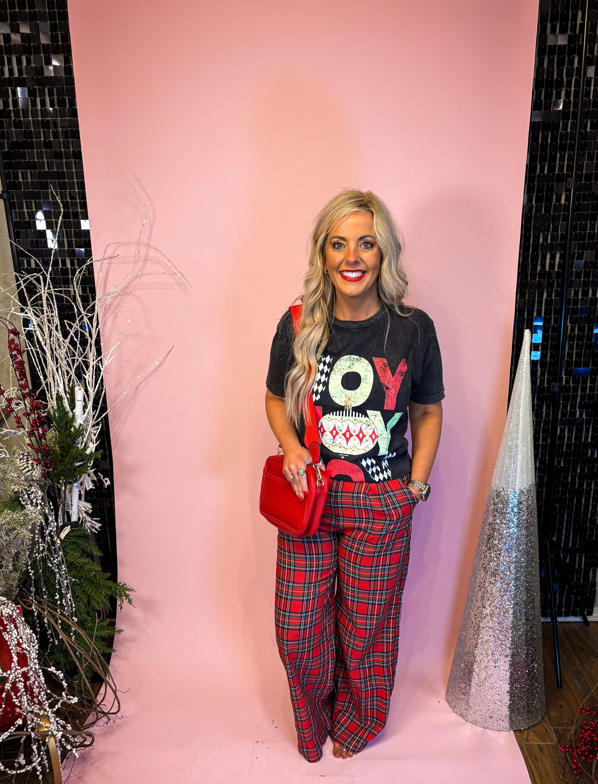 Crystal is wearing her true size small. She has paired the Joy graphic for a full festive look!