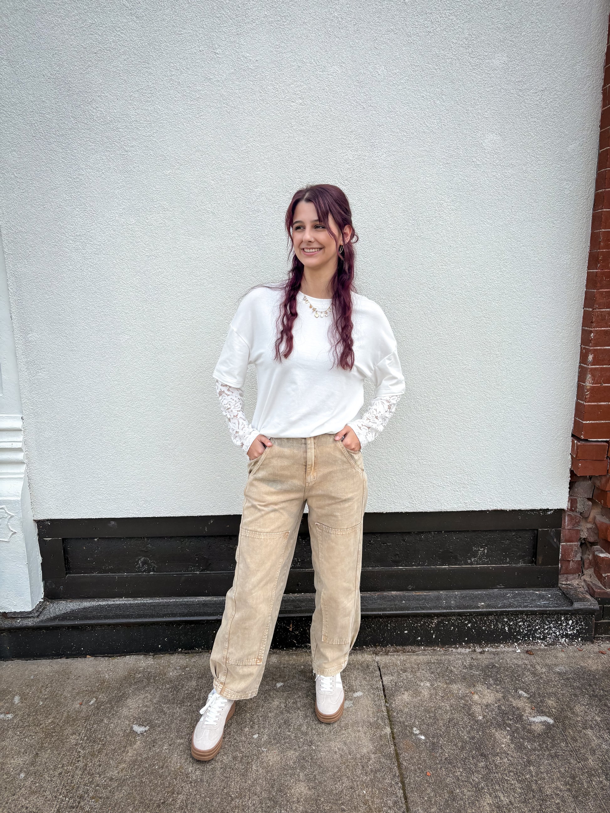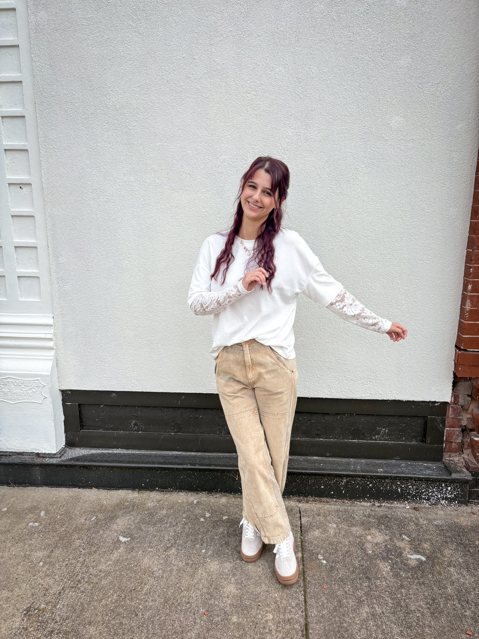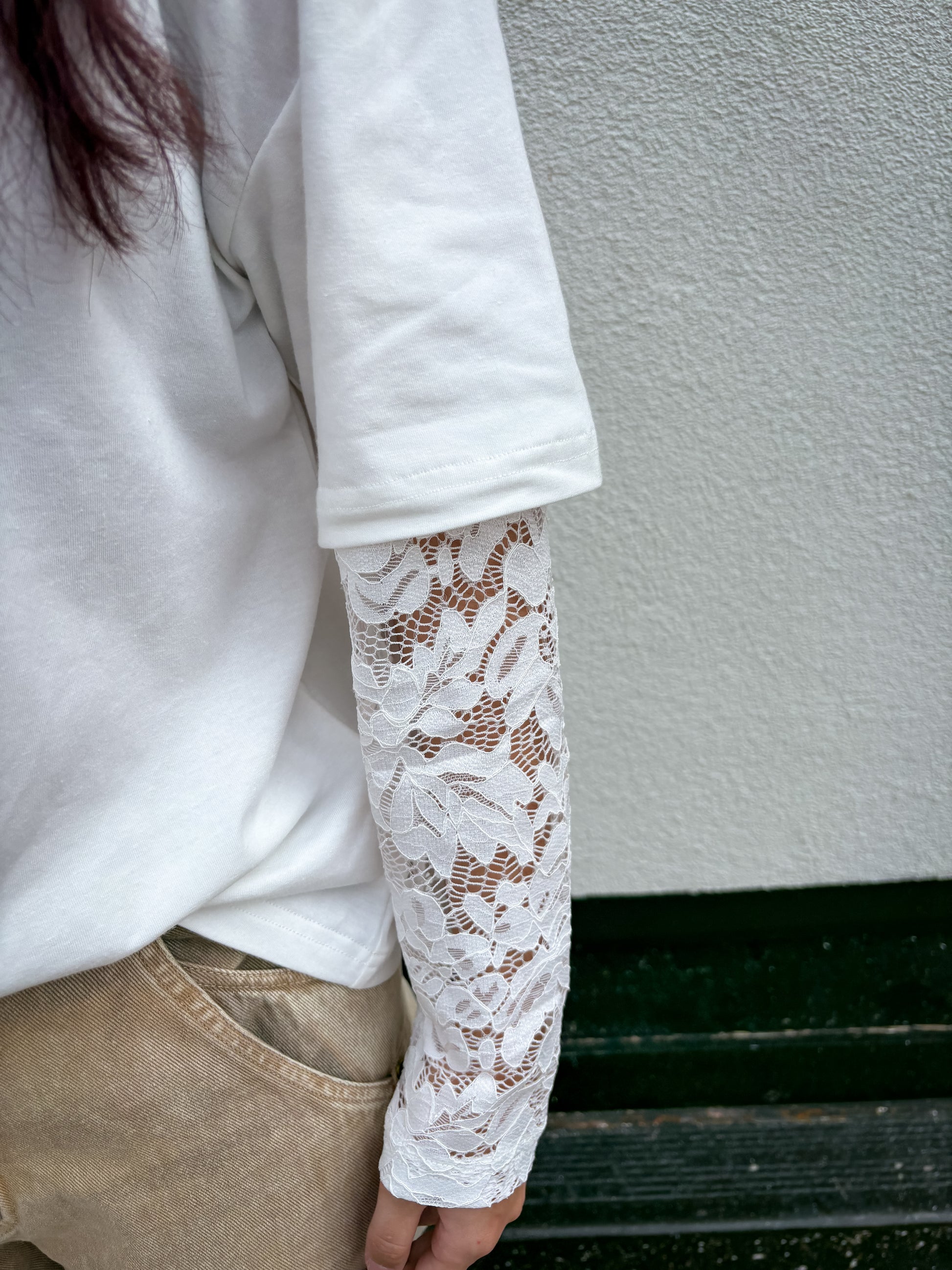 A fresh twist on a classic, this white tee features built in lace long sleeve for a layered look without the bulk. The soft body keeps it casual and comfortable, while the delicate lace sleeves add a touch of elegance and texture.
