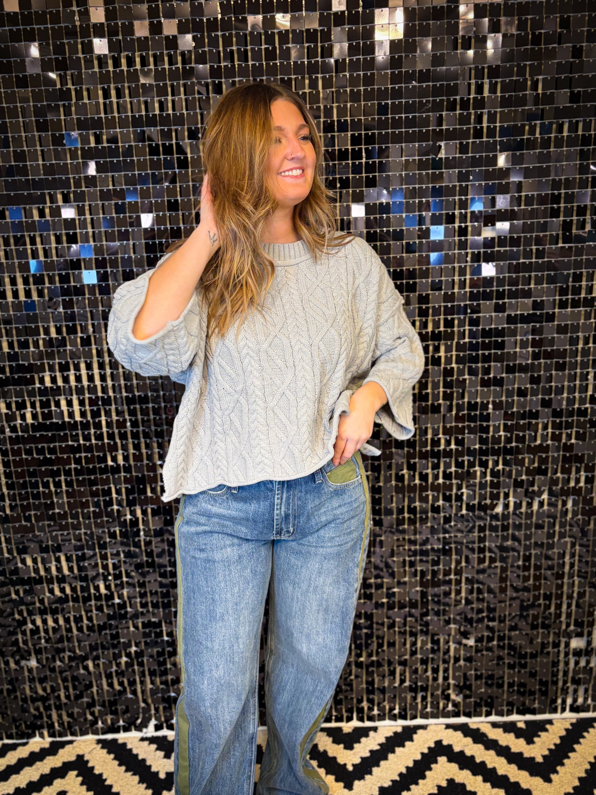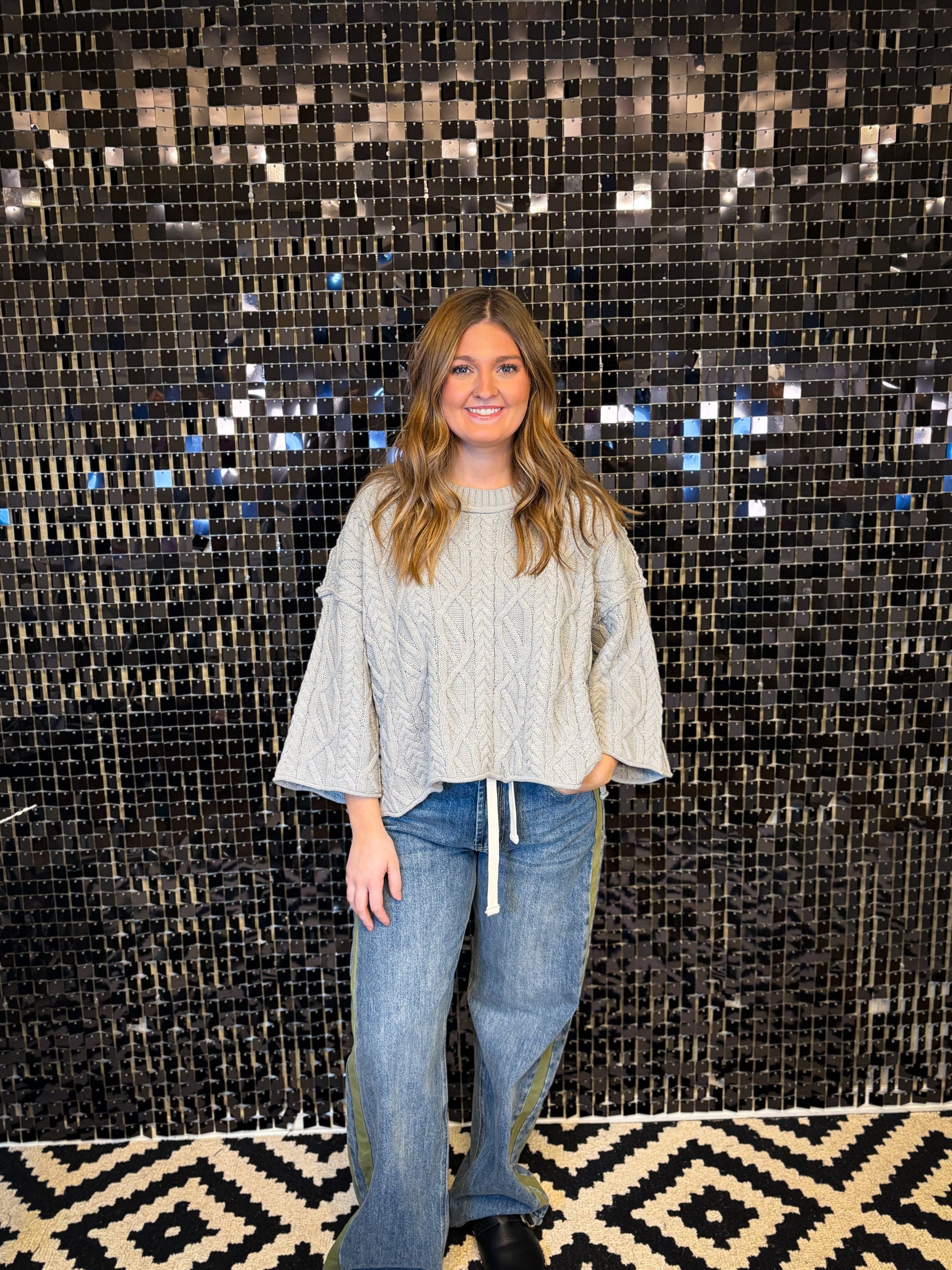 Boxy. Cozy. Effortlessly cool. This grey knit with drop shoulders and a raw cropped sleeve is the definition of laid-back style.