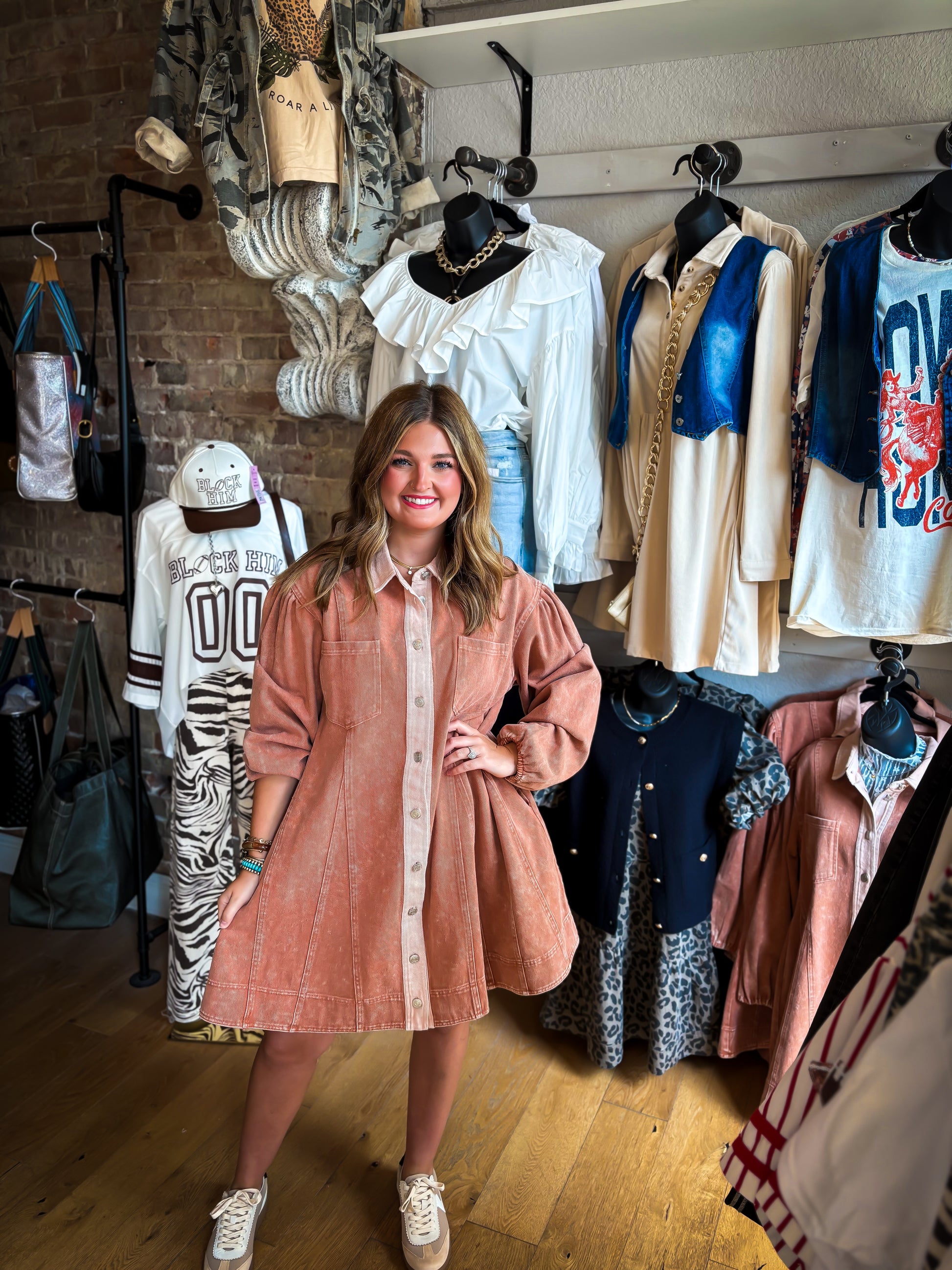 Soft meets structure in this charming blush pink denim dress. Crafted from durable yet comfortable denim, this piece features a full button-down front for a classic, effortless look. The subtle balloon sleeves add a touch of femininity and volume without overwhelming the silhouette, making it a standout style for everyday wear or casual outings. Perfect for pairing with sneakers or a boot!